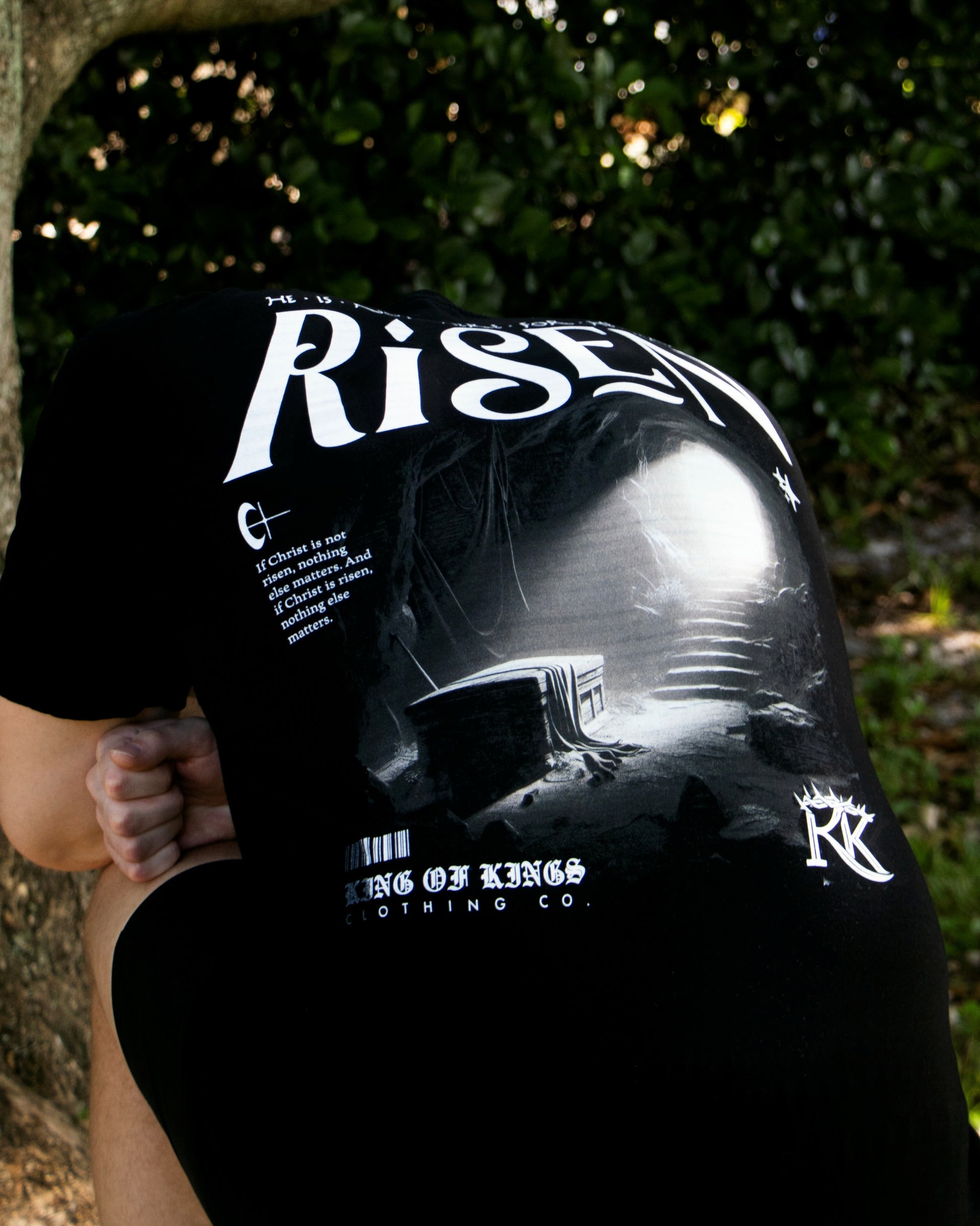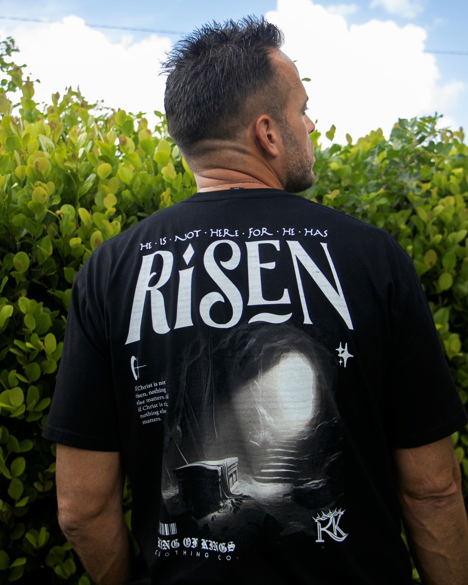 This shirt carries the powerful declaration of the Resurrection—the cornerstone of the Christian faith. With these words, we celebrate the victory of Jesus over sin and death, and the hope that His resurrection brings to all believers. It is a bold reminder that our Savior lives, and because of Him, we have new life. Wear it proudly as a statement of faith, celebrating the eternal hope found in the risen Christ.