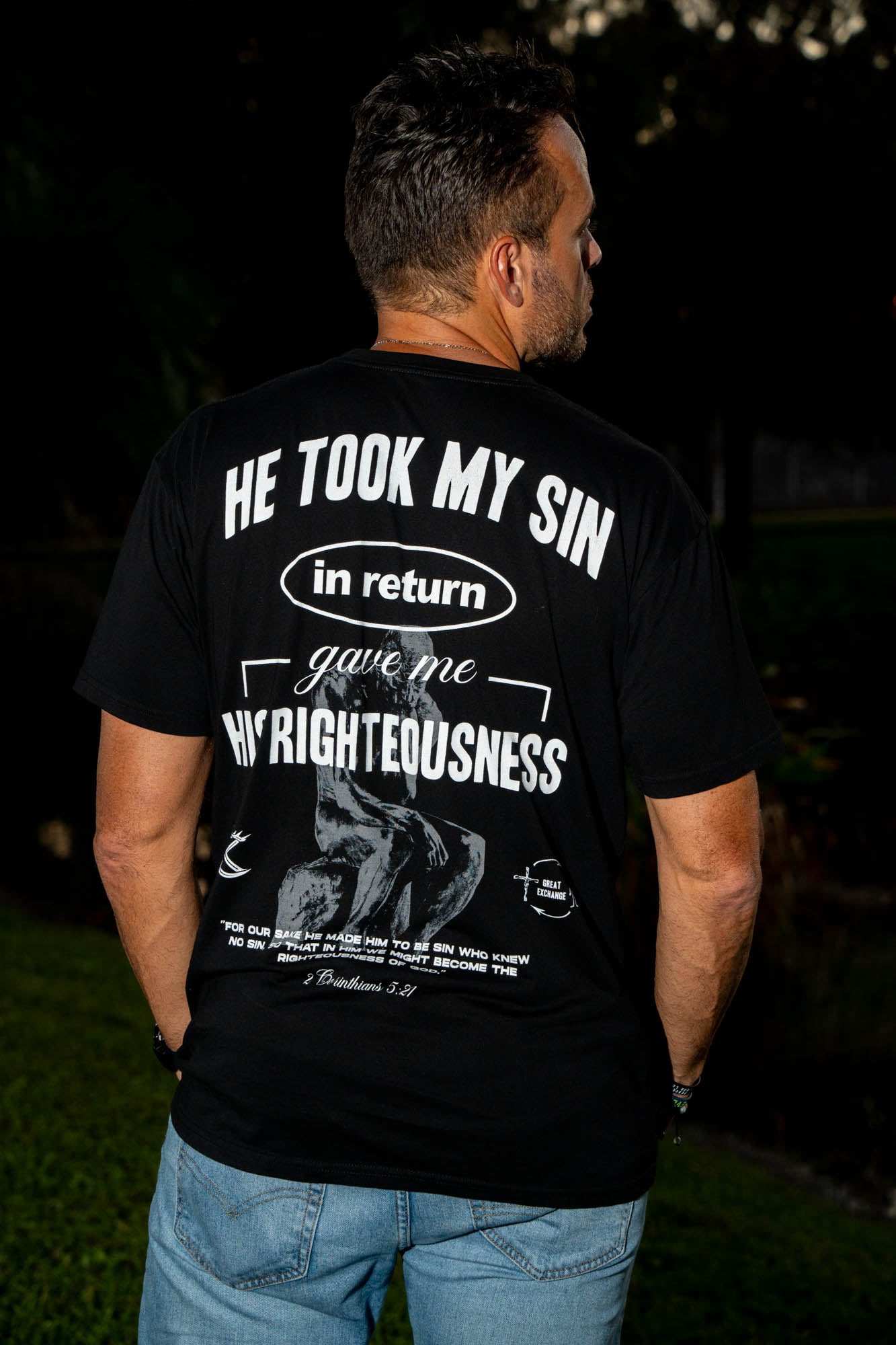 This shirt is more than apparel—it's a declaration of the Gospel. It speaks of the profound moment when Jesus bore our sin and, in return, clothed us in His righteousness. It's a reminder of God’s unmatchable grace, turning our brokenness into redemption and our unworthiness into a new identity as His beloved. Every time you wear it, you carry the story of salvation and invite others to experience the life-changing power of the Great Exchange.
